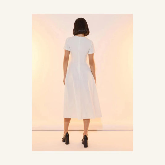 Bow Accent Round Neck A-Line Midi Dress in Ivory