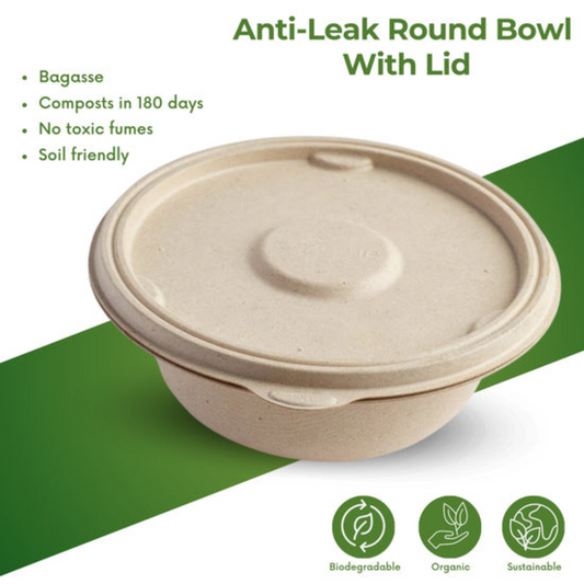 250 PCs of 1000ml Round Biodegradable Bagasse Containers with Lid – Eco-Friendly, Anti-Leak & Disposable | Size: Diameter 20 cm × Height 7 cm | Shape: Round | Color: Natural Brown | Category: Containers