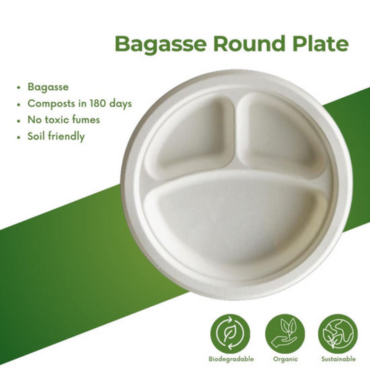 800 PCs of 9″ 3-Compartment Biodegradable Bagasse Plates – Eco-Friendly, Leak-Proof & Disposable | Material: Sugarcane Pulp | Size: 9 Inch | Compartments: 3 | Color: Natural Brown | Category: Plates